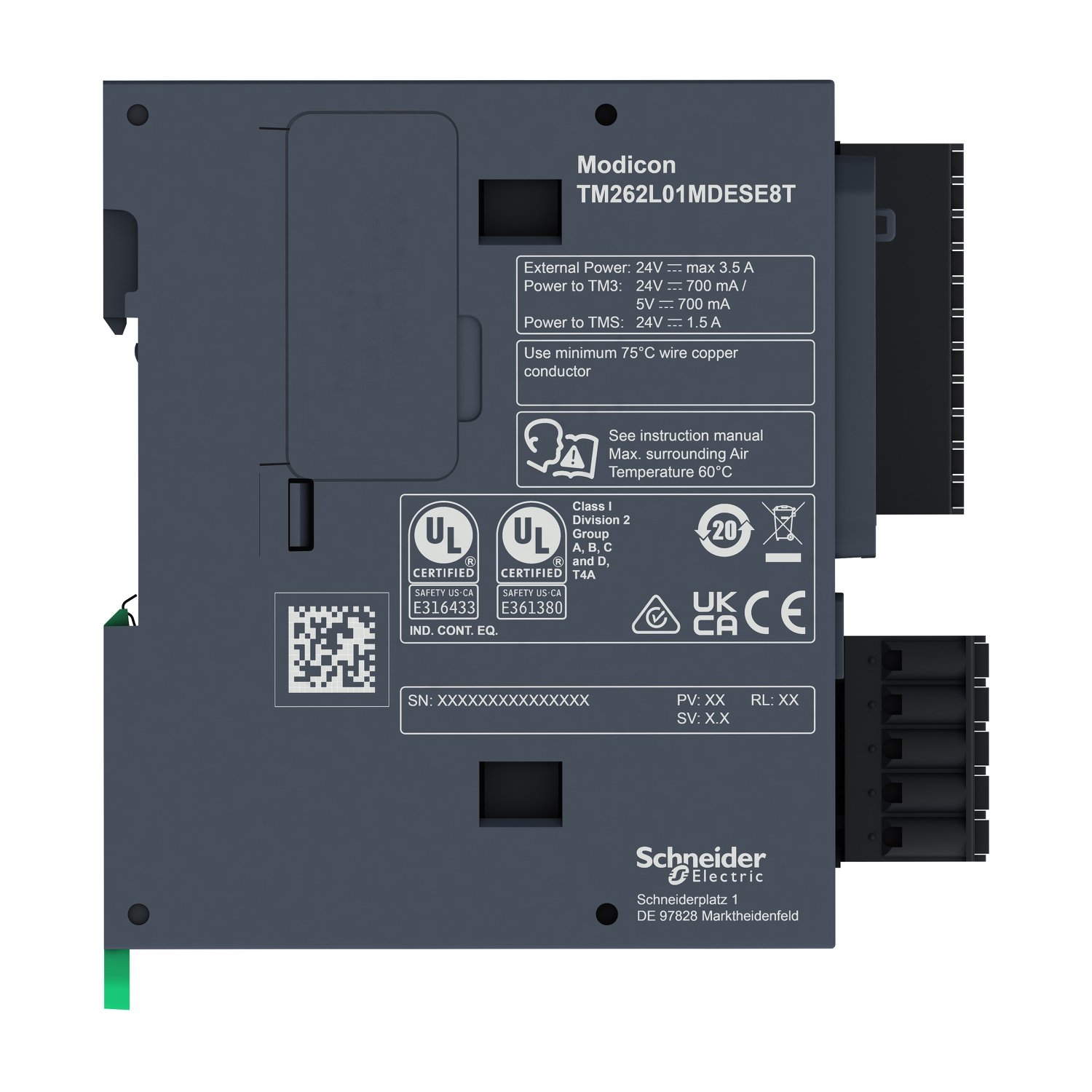 O módulo PAC distribuído Modicon M262 faz parte da linha de controladores de hardware EcoStructure Automation Expert.. É um controlador dPAC otimizado que suporta o catálogo de E/S Modicon TM3.. O controlador carrega até 448 canais de E/S discretos. 112 canais de E/S analógicos e 14 (7 locais + 7 remotos) módulos de expansão de barramento Modicon TM3.. Modicon M262 dPAC é o controlador para máquinas de médio porte e processos distribuídos. Ele incorpora o cliente e o servidor OPC UA para facilitar sua integração vertical e horizontal nas arquiteturas.. Ele é alimentado com uma fonte de alimentação DC de 24V não isolada. tem uma proteção contra sobrecarga integrada. incorpora um processador dual-core e uma capacidade de memória de 256MB. e atinge um desempenho de 5ns por instrução.. Este controlador lógico tem dois barramentos de comunicação (Ethernet TCP/IP e Serial). um barramento de E/S e uma porta de E/S.. Pesa 0. 655 kg (1. 444 lb).. Certificado com CE. cULus HazLoc. RCM. Em conformidade com IEC/EN 61131-2. UL 61010-1. UL 61010-2-201. ANSI/ISA 12.12.01-2007. CSA C22.2 No.213.. Este controlador suporta módulos de expansão de E/S Modicon TM3.. O controlador lógico Modicon M262 é instalado em trilho DIN de 35 mm com travas Clip-on.