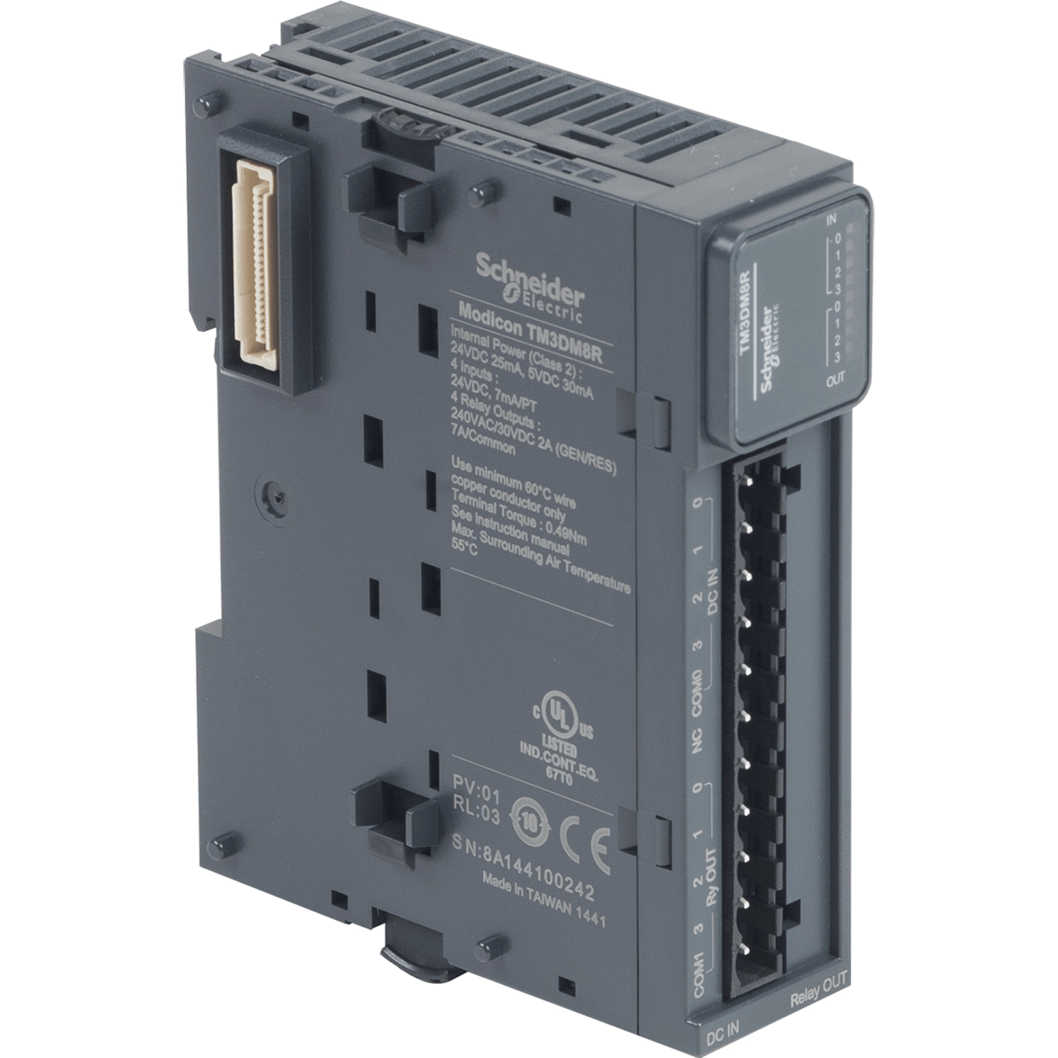 Este produto faz parte da faixa Modicon TM3, uma oferta de módulos de E/S de expansão para Modicon M221, M241, M251 e M262.O módulo de E/S discreto fornece 4 canais de entrada, 4 canais de saída de relé com lógica discreta de coletor ou fonte (positiva/negativa).Este produto é capaz de controlar unidades de velocidade variável ou qualquer dispositivo equipado com uma entrada de corrente ou tensão.Há um isolamento entre entrada/saída e lógica interna a 500V CA, grupos de entrada e saída a 1500V CA, Abra o contato a 750V CA e não isolado entre entradas/saídas.É mobiliado com terminal de parafuso removível para conexão elétrica com ajuste de inclinação de 5,08 mm para entradas e saídas.É um produto com classificação IP20.Suas dimensões são de 27,4 mm (largura) x 84,6 mm (profundidade) x 90 mm (altura).Ele pesa 0,120 kg.
