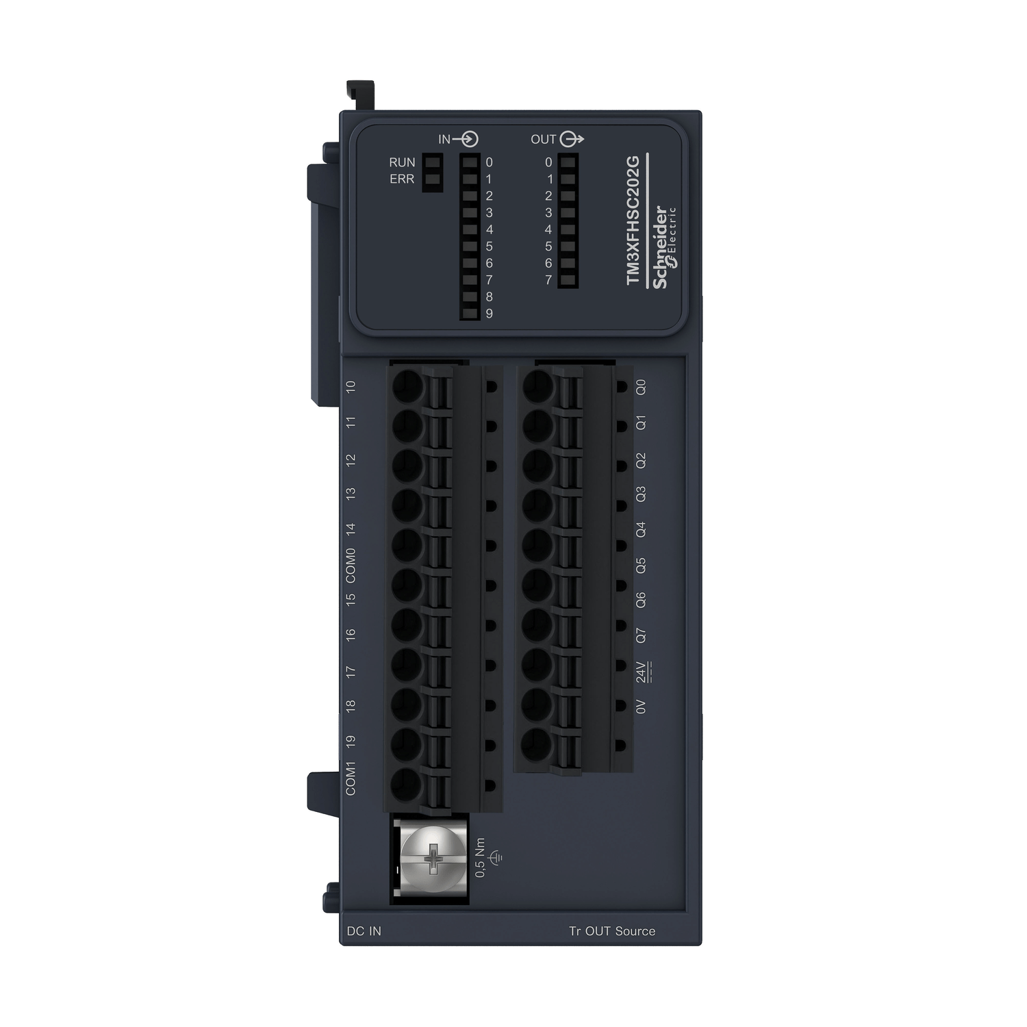 Este produto faz parte do Modicon TM3, uma gama de módulos de E/S de expansão para os PLCs Modicon.Este módulo contador fornece 10 entradas rápidas e 8 saídas rápidas.É um contador de alta velocidade com gerenciamento de saída reflexo, sem gerenciamento de eventos.Ele é usado para contar os pulsos gerados por um sensor ou para processar sinais de um codificador incremental.Sua frequência de contagem é de 200kHz. Funciona através de uma fonte de alimentação externa 24VDC.É dotado de terminal de mola removível para conexão elétrica com ajuste de passo de 3,81mm para entradas e alimentação.É um produto com classificação IP20. Suas dimensões são 39mm de largura, 85mm de profundidade e 90mm de altura. Pesa 0,150kg,Ele é projetado para aceitar sinais de entrada do tipo pulso de alta velocidade para contagem e para fornecer sinais de saída do tipo pulso de alta velocidade.Este produto é certificado pela CSA, cULus, IACS E10, RCM, CE, UKCA e EAC.Este módulo é compatível com o controlador lógico/de movimento Modicon M262 e é configurável com o software especialista em máquinas EcoStruxure.É entregue em 1 pacote (tipo PCE).Ele é montado em um trilho DIN simétrico. Ou com um kit específico para montagem de placas ou painéis.O sistema de E/S Modicon TM3 especialmente desenvolvido permite a expansão flexível e personalizável dos terminais de E/S em todos os controladores.Do projeto e desenvolvimento ao comissionamento e manutenção, o EcoStruxure Machine Expert é uma solução completa de construção de máquinas.