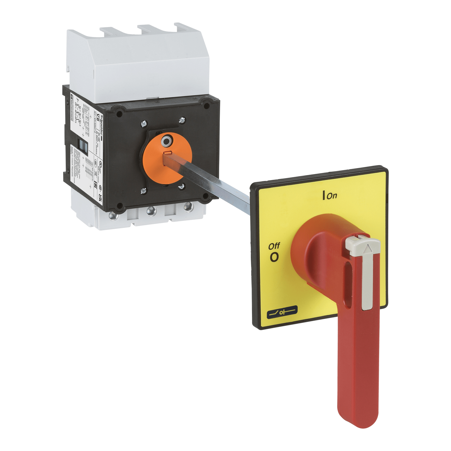 Chave seccionadora TeSys Vario para montagem na parte traseira de um painél, 3 pólos, 125A/690V, para aplicações de comutação de motores até 37kW@400V AC-23.Unidade completa composta por um corpo de interruptor V5, um eixo de extensão VZN18, uma placa de intertravamento de porta KZ74, uma manopla vermelha com placa frontal amarela 90x90mm KCF3PZ.Destinado ao uso de desconexão do interruptor de parada principal e de emergência.alça bloqueável, para 3 cadeados (a encomendar em separado).maçaneta com 4 parafusos de fixação na porta, garantindo IP65 à fixação.Possível distância entre a parte traseira do invólucro e a porta 330-350mm.Certificação multipadrões (IEC, UL, CSA, CCC, EAC, Marine), compatível com Green Premium (RoHS/REACh).