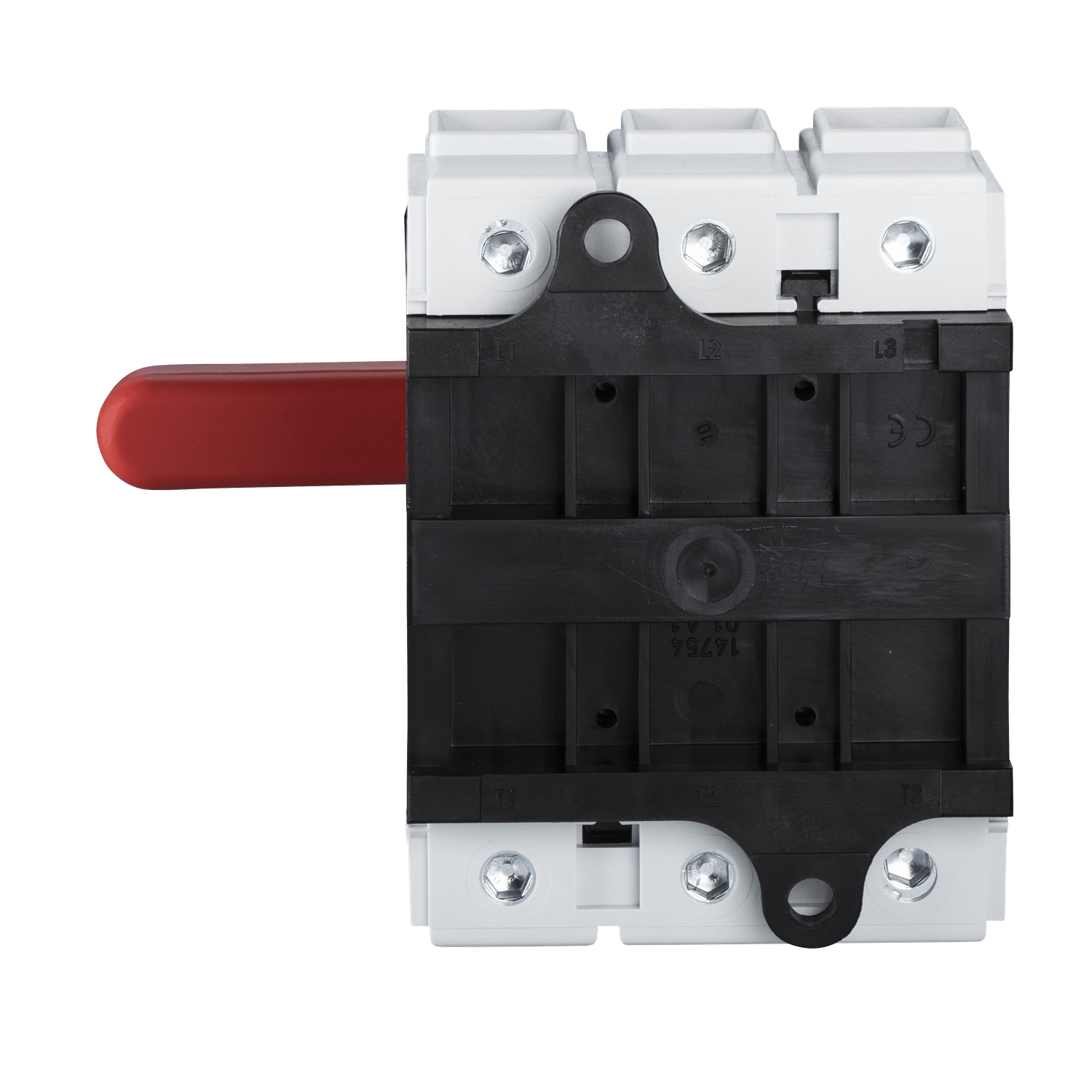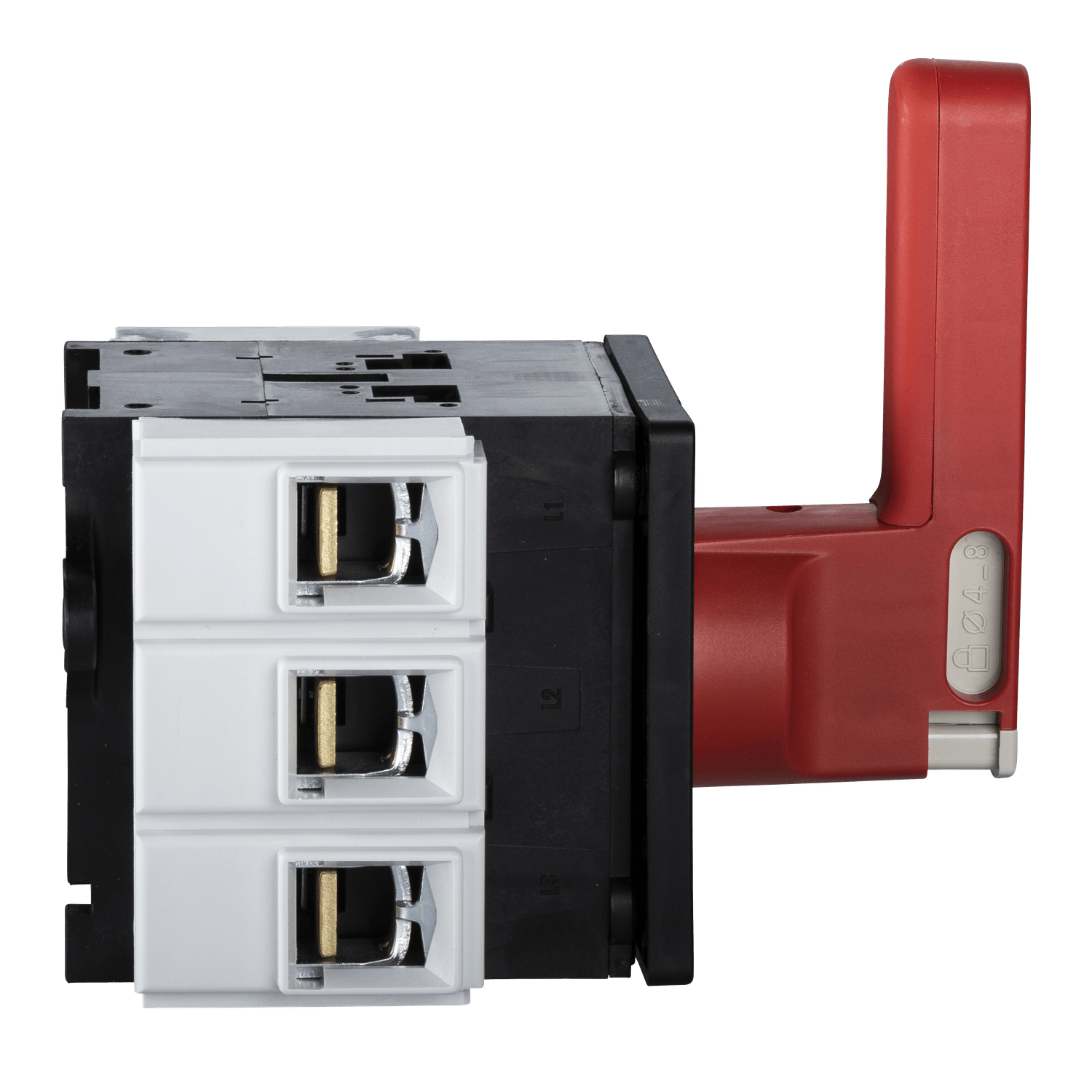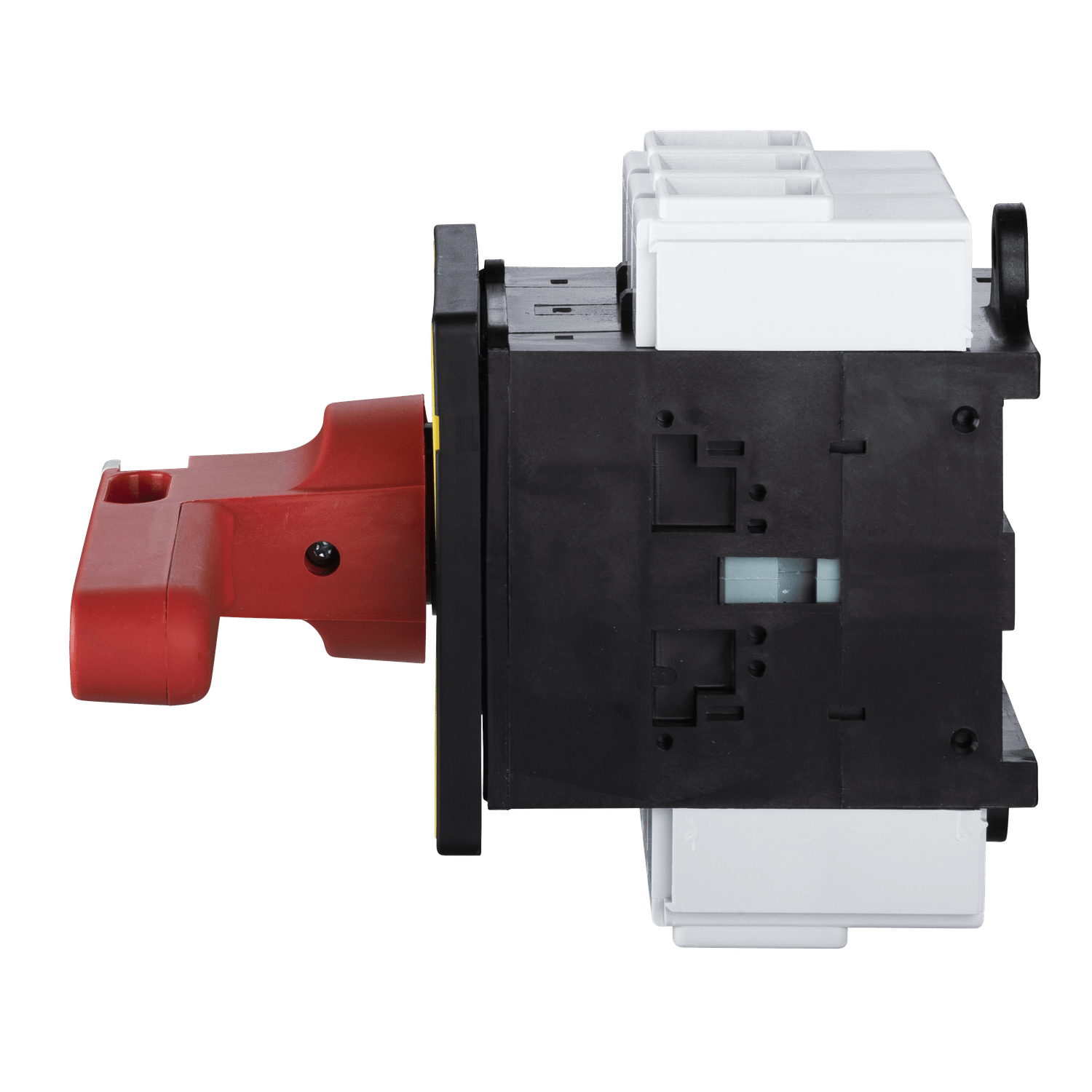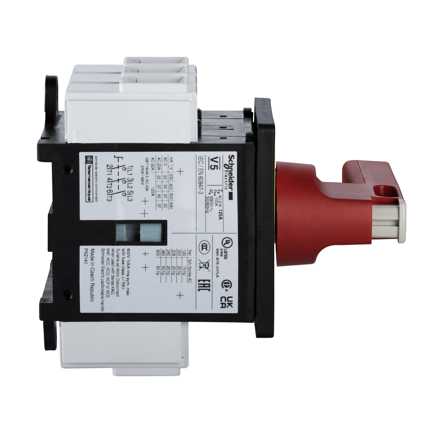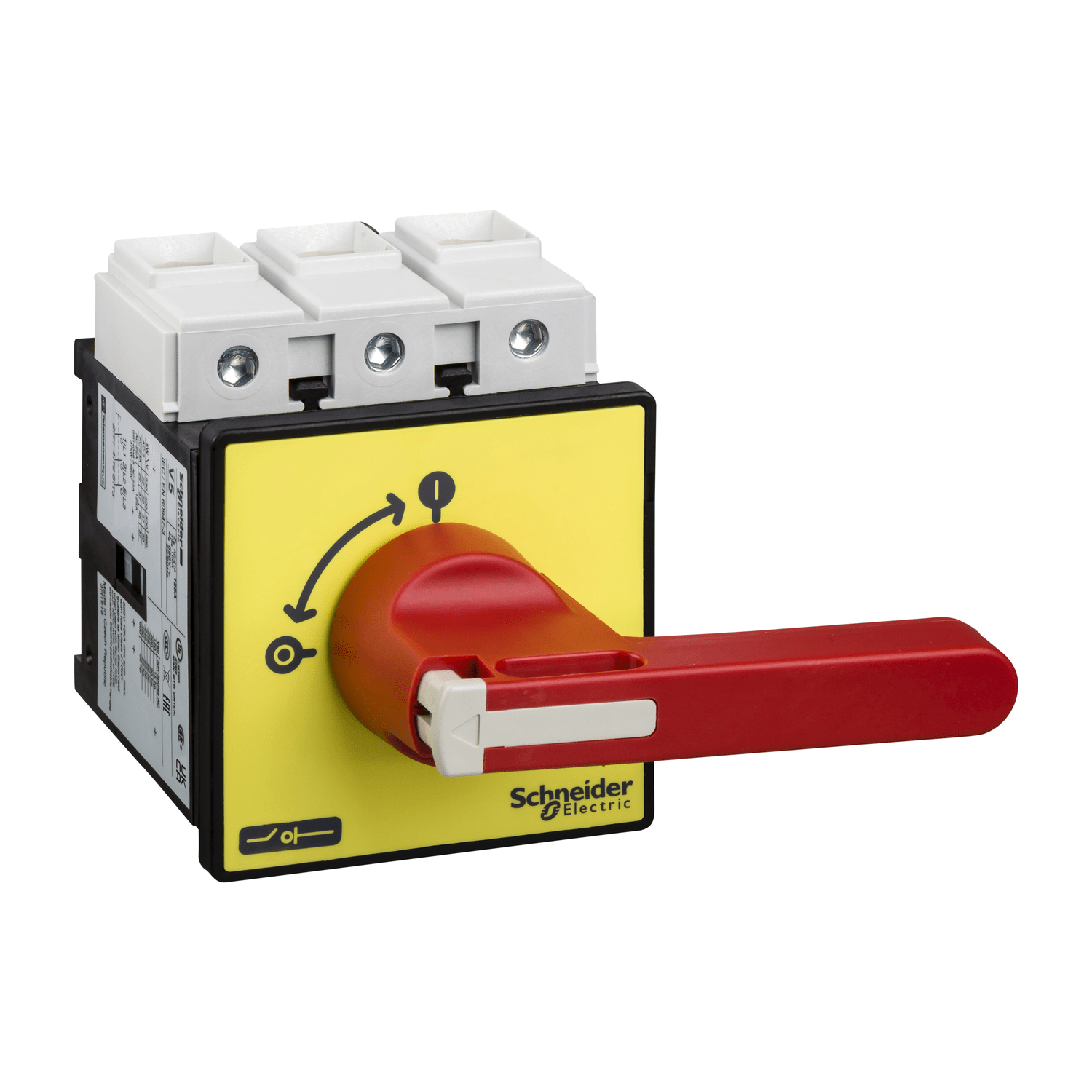 Chave seccionadora TeSys Vario para montagem em porta, 3 polos, 125A/690V, para aplicações de comutação de motores até 37kW@400V AC-23.Unidade completa composta por um corpo de interruptor V5, uma manopla vermelha com placa frontal amarela 90x90mm KCF3PZ.Destinado ao uso de desconexão do interruptor de parada principal e de emergência.alça bloqueável, para 3 cadeados (a encomendar em separado).maçaneta com 4 parafusos de fixação na porta, garantindo IP65 à fixação.Certificação multipadrões (IEC, UL, CSA, CCC, EAC, Marine), compatível com Green Premium (RoHS/REACh).