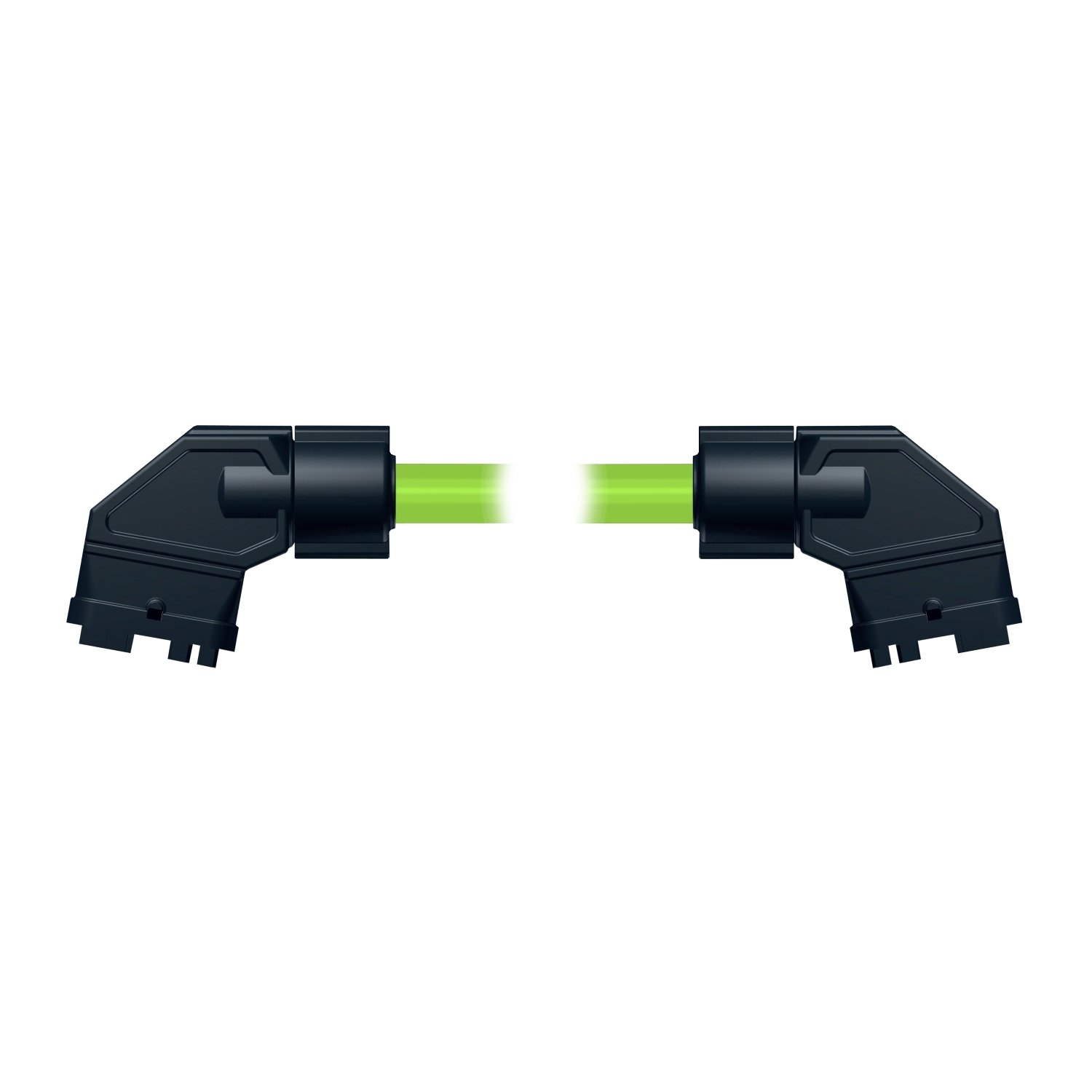 Cabo híbrido para automação baseada em movimento com PacDrive 3. Este cabo híbrido inclui o barramento CC, o fieldbus Sercos, 24 V e o sinal de habilitação do inversor. Ele conecta os módulos de distribuição ILM62DB entre si ou aos servoacionadores Lexium 62 ILD e ILM. A conexão é feita através de conectores D1 em ambas as extremidades (esquerda). O comprimento do cabo é de 10 m.