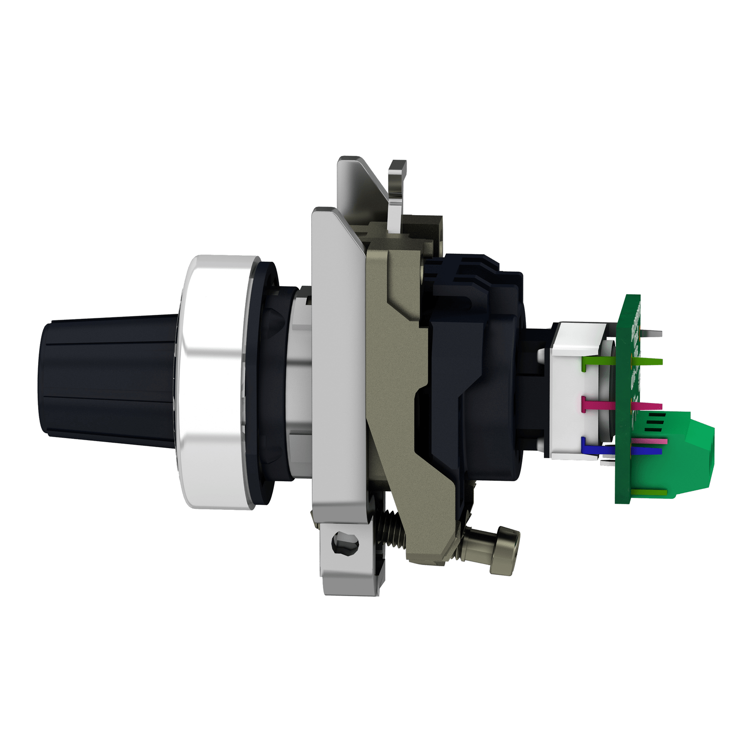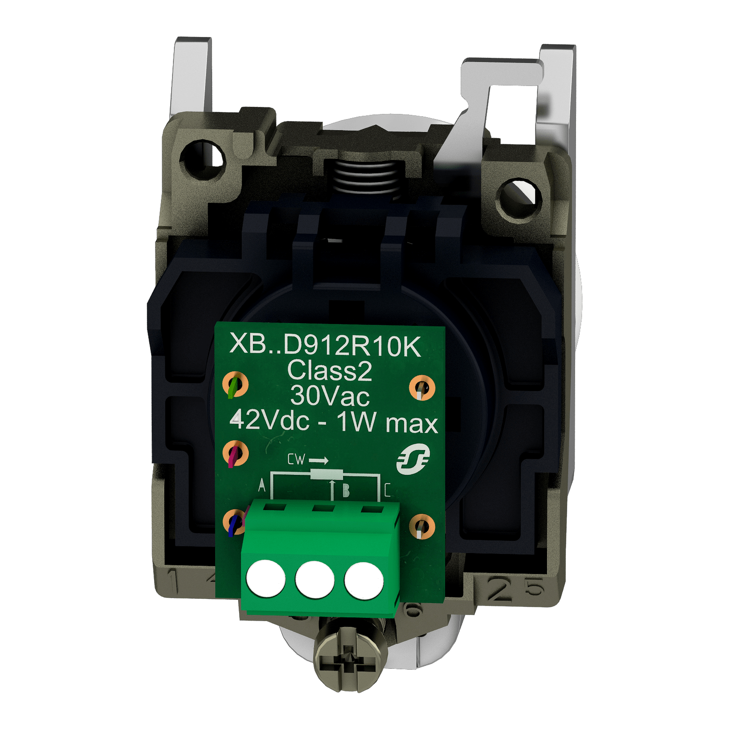 O XB4BD912R10K é um potenciômetro Harmony XB4 que possui uma resistência de 10kΩ.Possui uma moldura de metal.Este potenciômetro fornece uma interface externa para controlar parâmetros-chave dos componentes de automação, como inversores e controladores.É facilmente instalado em furos padrão de 22 mm de diâmetro e conectado com conexões simples de braçadeira de parafuso.É resistente a impactos, à poeira, à água e à vibração graças ao seu IP66 IP69 IP69K, tornando-o ideal para operação em ambientes agressivos.É ideal para controle analógico (como controle de velocidade do motor) através da entrada de tensão ou resistor de inversores de frequência.