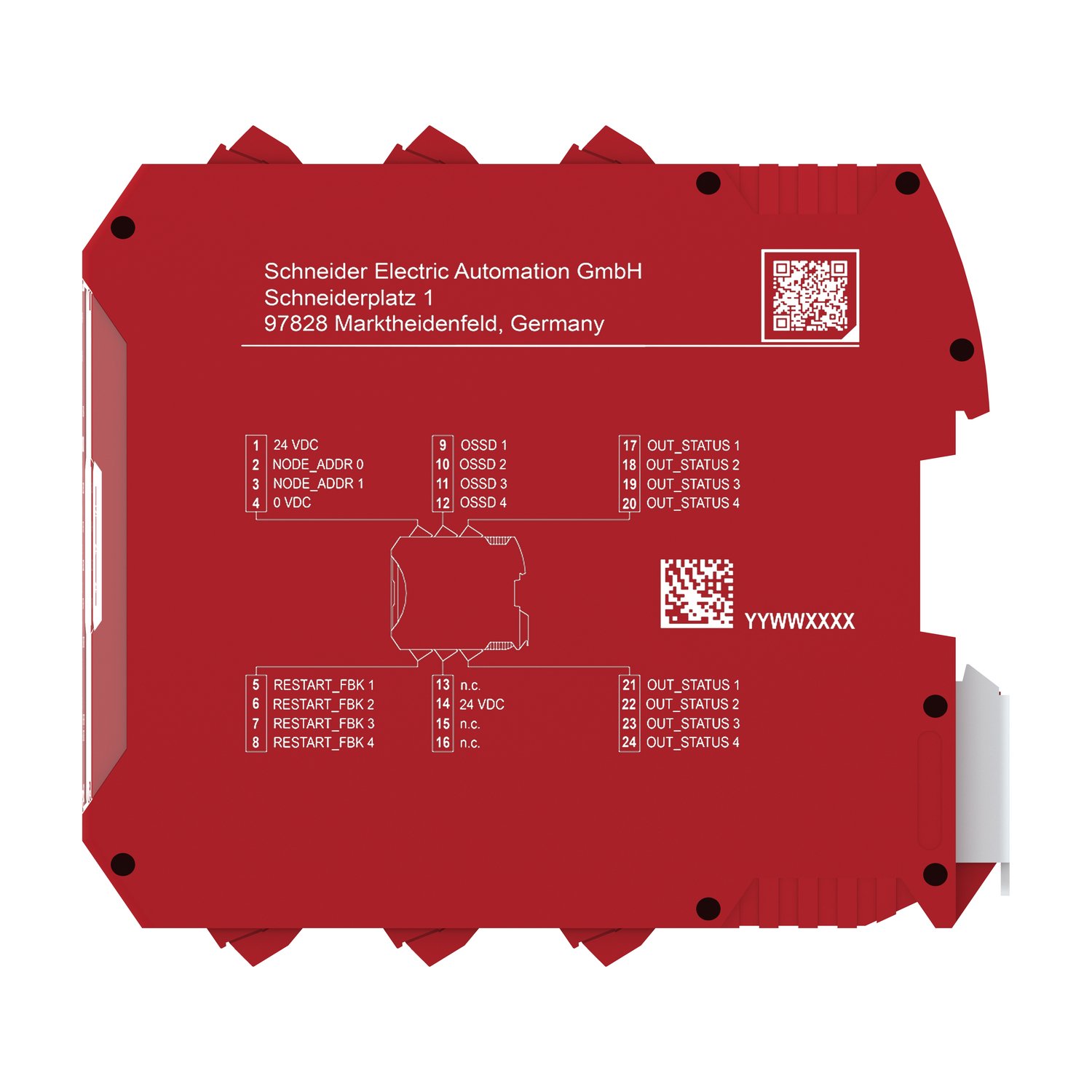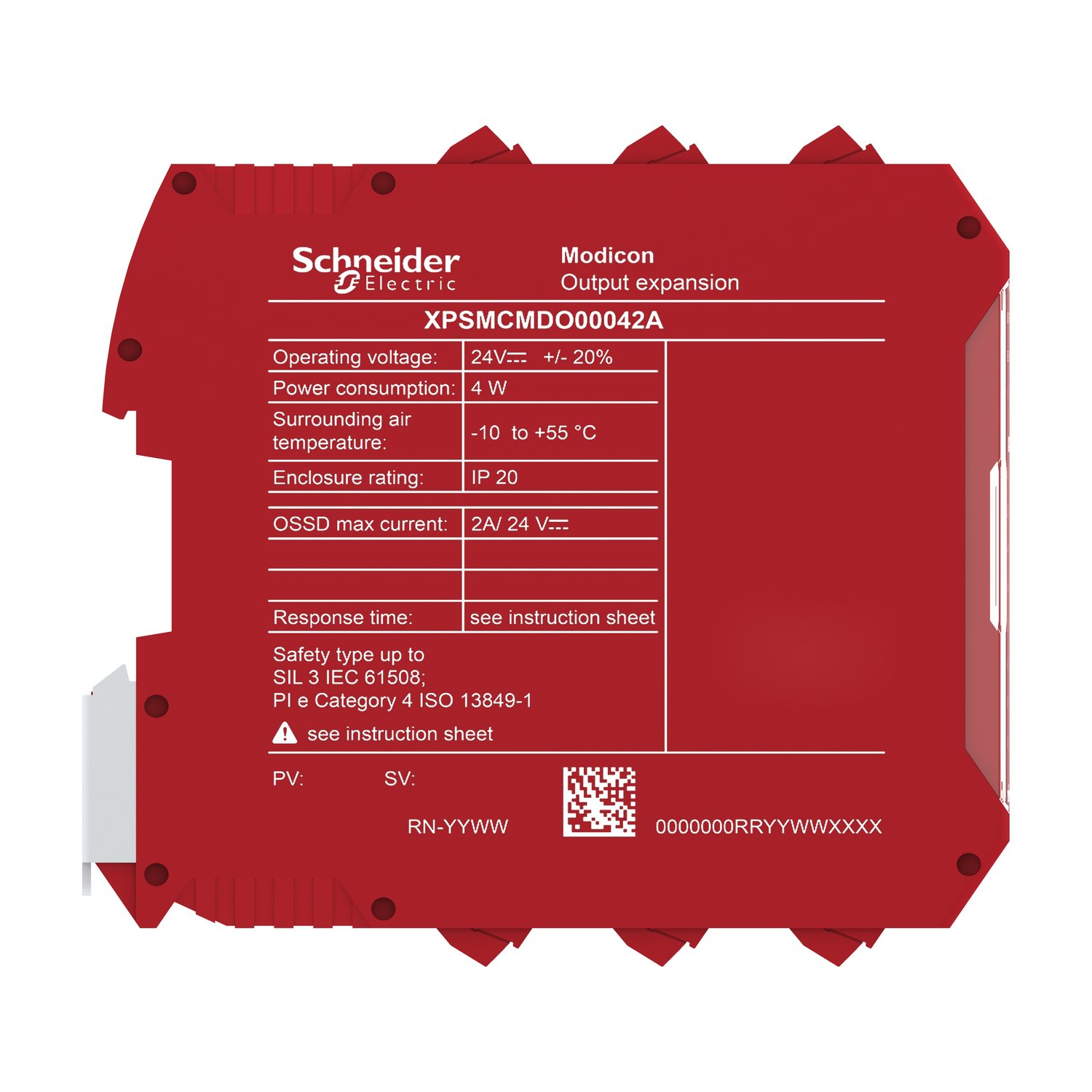 Este módulo de expansão de saída seguro do MCM MCM possui 4 de alto canal único OSSD de alta corrente (2A). que pode ser usada como 4 ou 2 ou 2 ou 2 OSSD + 8 status Saídas SIL 1/ PL C e é equipado com terminais de pinças de parafuso em cativeiro.. Ele foi projetado para monitorar remotamente sua E/S segura.. É fornecido com terminais de grampo parafuso. bloco de terminal removível para conexão elétrica.É um produto com classificação IP20.. Este módulo de E/S seguro figura os atrasos configuráveis de ativação da saída e desativação. controle independente de pares de saídas e sinais de saída de diagnóstico configuráveis.. Este módulo calcula os LEDs em sua face frontal. exibindo o status (fonte de alimentação. execução. erros internos ou externos. status de entrada e saída).. Este módulo de E/S seguro está conectado ao controlador de segurança através do conector de expansão do backplane.. Ele pesa 0. 15 kg.Sua dimensão é de 22. 5 mm (profundidade). 99 mm (altura) e 114. 5 mm (largura).Sua moradia é vermelha.É alimentado com 24 VCC.. É ideal para monitorar funções de segurança. como parada de emergência. monitoramento de guarda. guarda de perímetro. monitoramento de posição. monitoramento de velocidade e movimento de possibilidade.. Acessórios compatíveis para o módulo Modicon MCM são um cartão de memória e o conector do backplane.. O módulo Instais no trilho DIN ômega 35mm em conformidade com EN 50022.. O sistema Modicon MCM Modular Safety Controller fornece flexibilidade e escalabilidade a partir de 8 entradas. 2 saídas de canal único/4 de até 128 entradas. 16 saídas de canal único/32. até 32 ou 48 saídas de status de diagnóstico.. O sistema de controlador de segurança modular Modicon MCM é projetado para monitorar várias funções de segurança dentro e ao redor de uma máquina para minimizar o risco de pessoas acessando as partes móveis perigosas da máquina.
