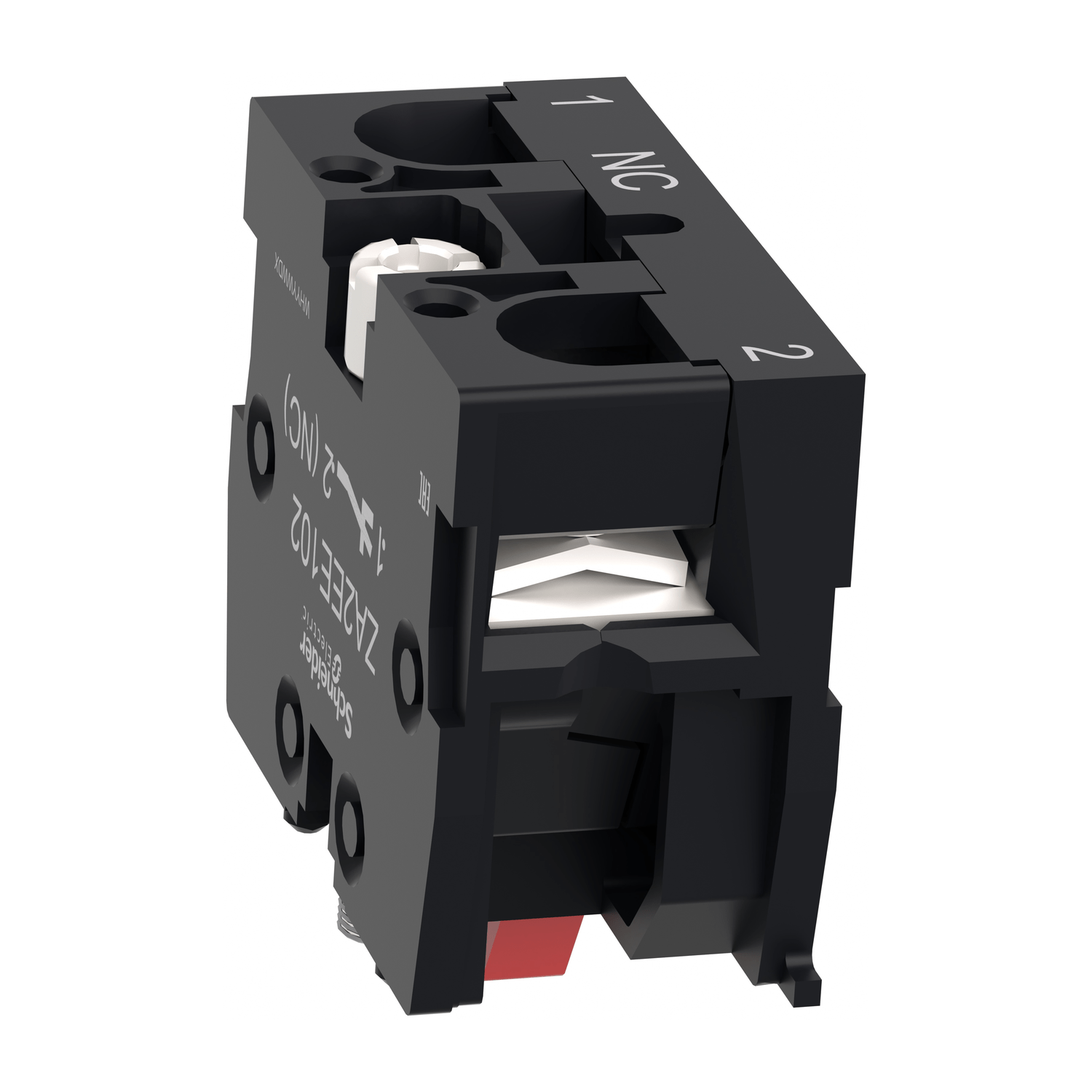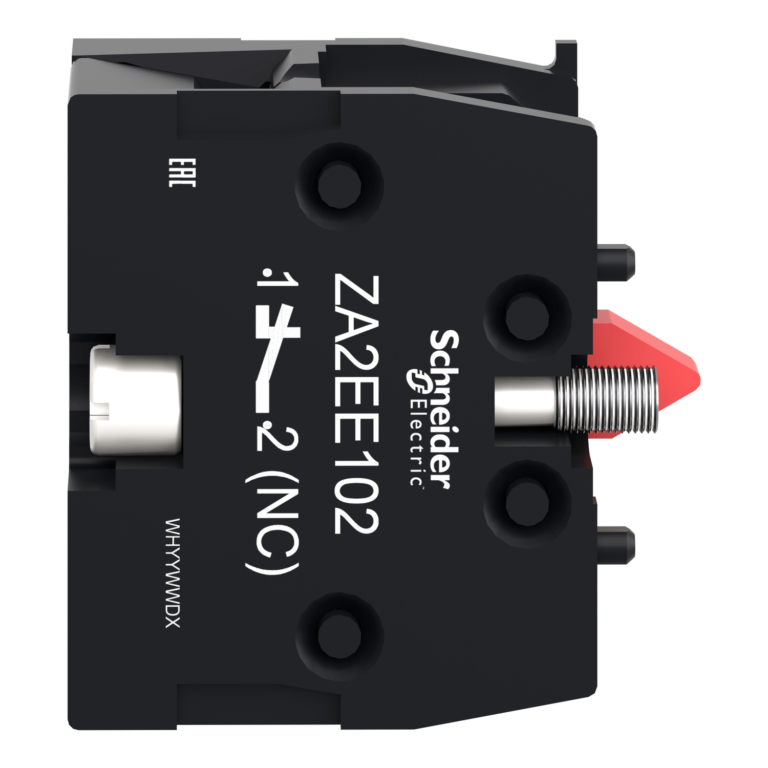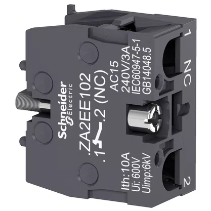 O ZA2EE102 é o bloco de contato que faz parte da linha Easy Harmony XA2, uma oferta de botões, chaves seletoras e sinalizadores plásticos de Ø 22mm.,Este bloco de contato permite a substituição e configuração rápida e fácil de seus botões e chaves seletoras.,Ele é facilmente instalado e substituído em unidades completas de botão de pressão e chaves seletoras XA2 e se conecta a circuitos de controle com conexões simples de braçadeira de parafuso.,Possui 1 contato NF com operação de interrupção lenta.,Ele usa material de contato de liga de prata.,Protege os operadores de contato inesperado com circuitos energizados devido ao seu índice de proteção IP20.,Ele foi projetado para operação de 1,5 milhão de ciclos.,É um produto com classificação IP20 e vem com certificação CE, CCC e EAC em conformidade com os padrões GB 14048.1, IEC 60947-1, GB 14048.5 e IEC 60947-5-1.,É facilmente instalado e substituído com conexões simples de fixação por parafuso.,É um produto com classificação IP20 e vem com a certificação CE, CCC e EAC em conformidade com as normas GB 14048.1, IEC 60947-1, GB 14048.5 e IEC 60947-5-1 .,Ele é facilmente instalado e substituído por simples conexões de parafuso de grampo.