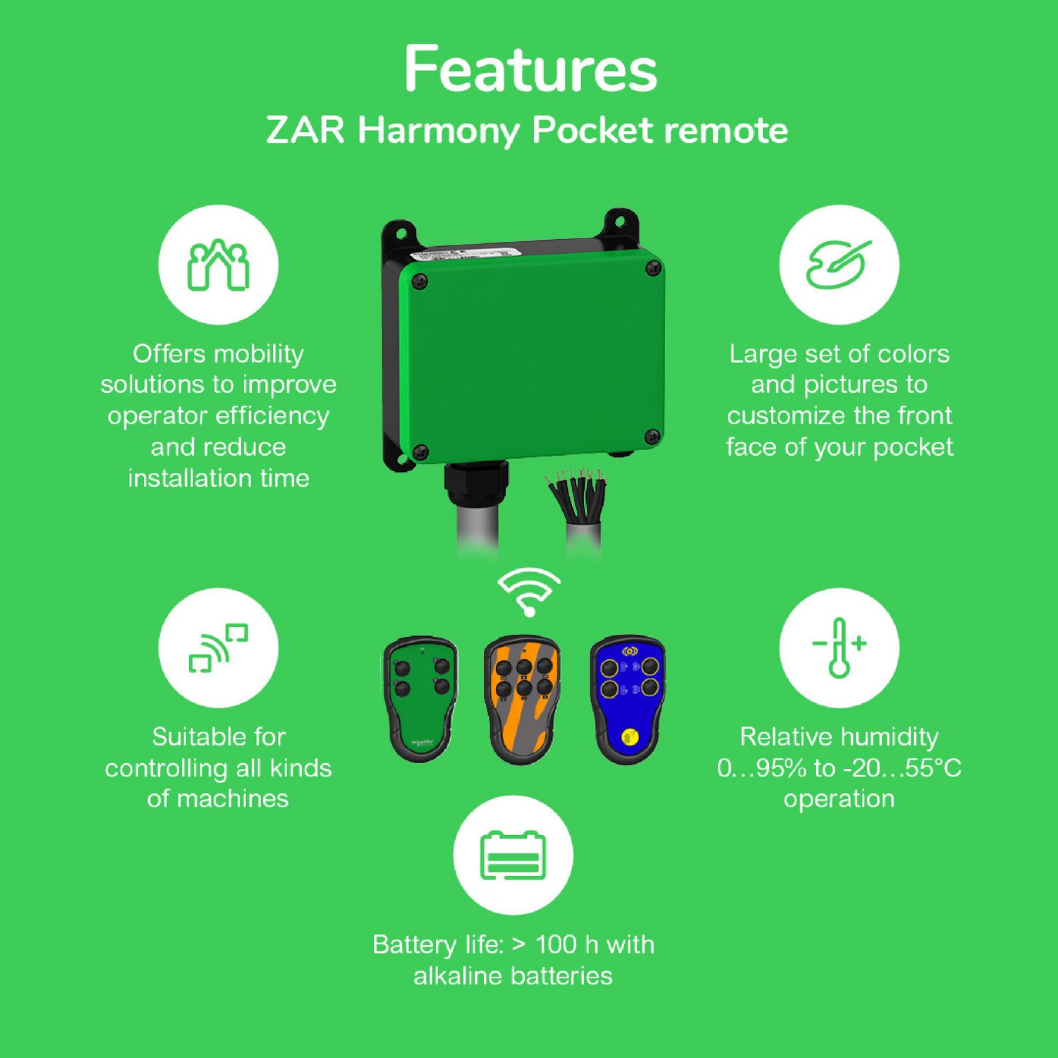 O ZART04 é um controle remoto (transmissor) com display da linha Harmony Pocket Remote. Foi projetado como um transmissor para sistema de controle remoto sem fio. Possui 4 botões de ação única e pode operar a uma distância de 50 m. É resistente a impactos (resistência), a poeira (resistência), à água (resistência) e a vibrações (resistência) graças ao seu IP67, tornando-o ideal para operação em ambientes agressivos (pesados). É compatível com a estação base ZARB18W e ZARB18H.