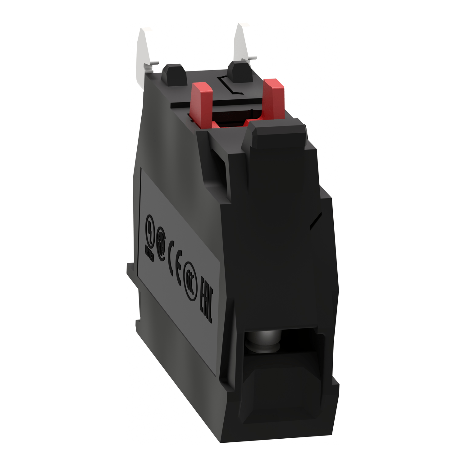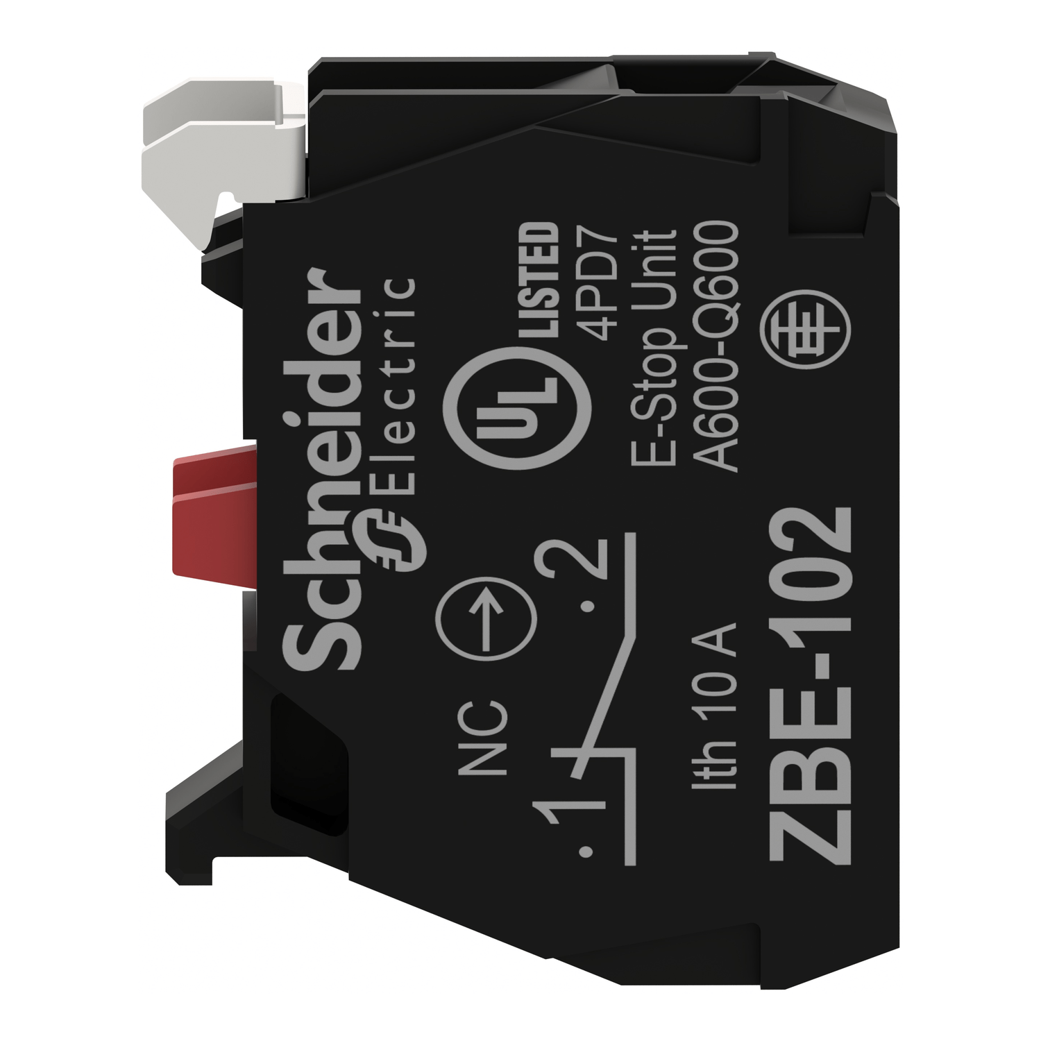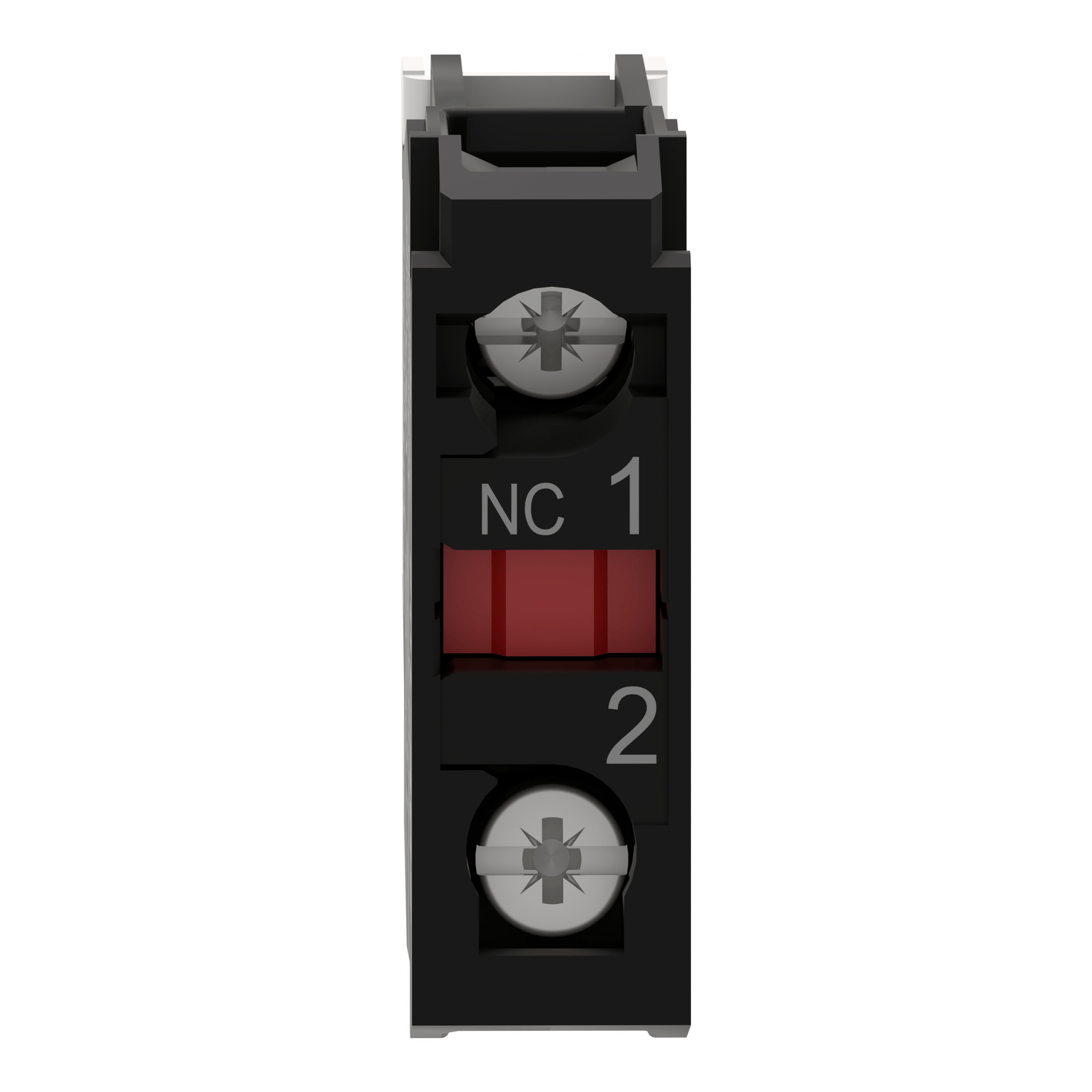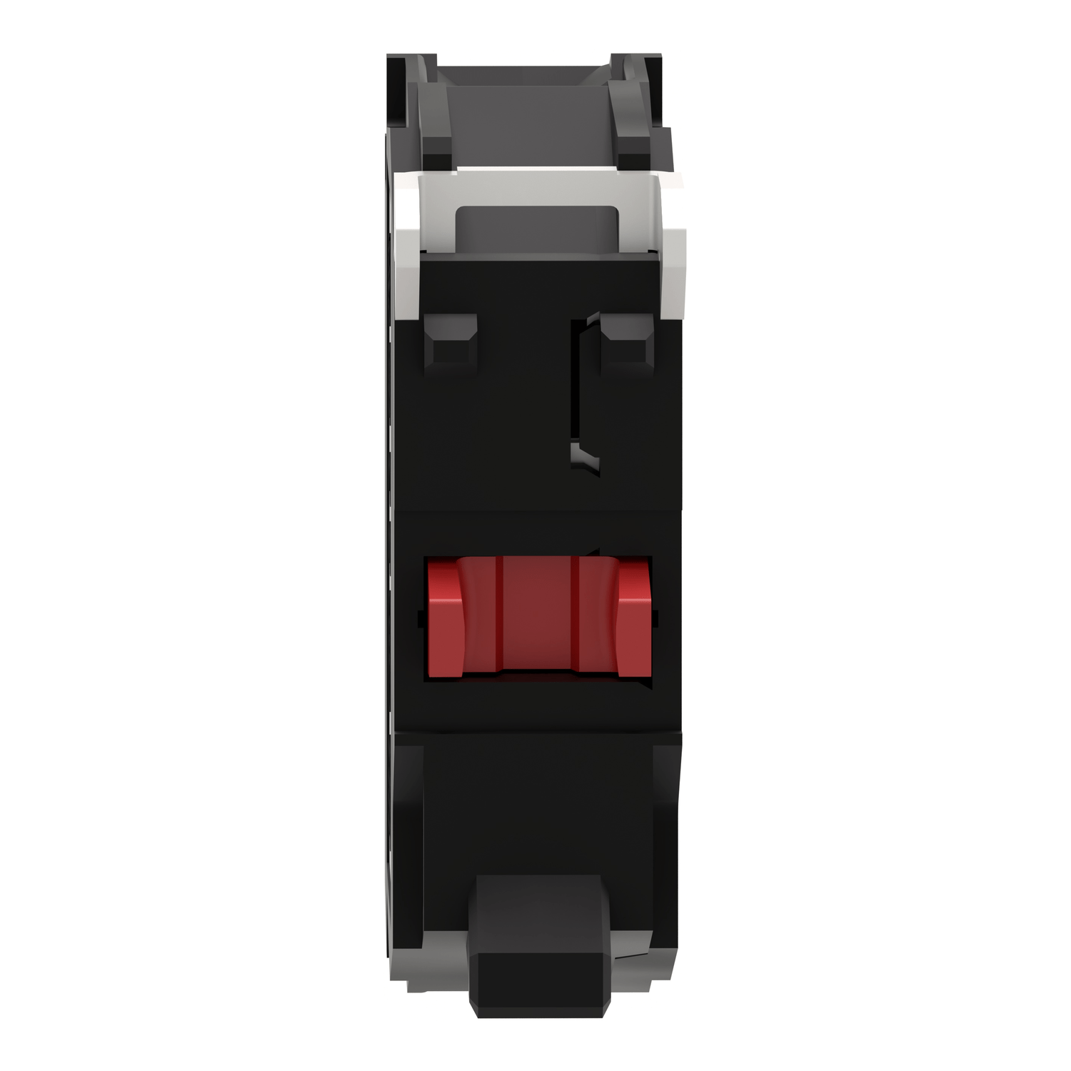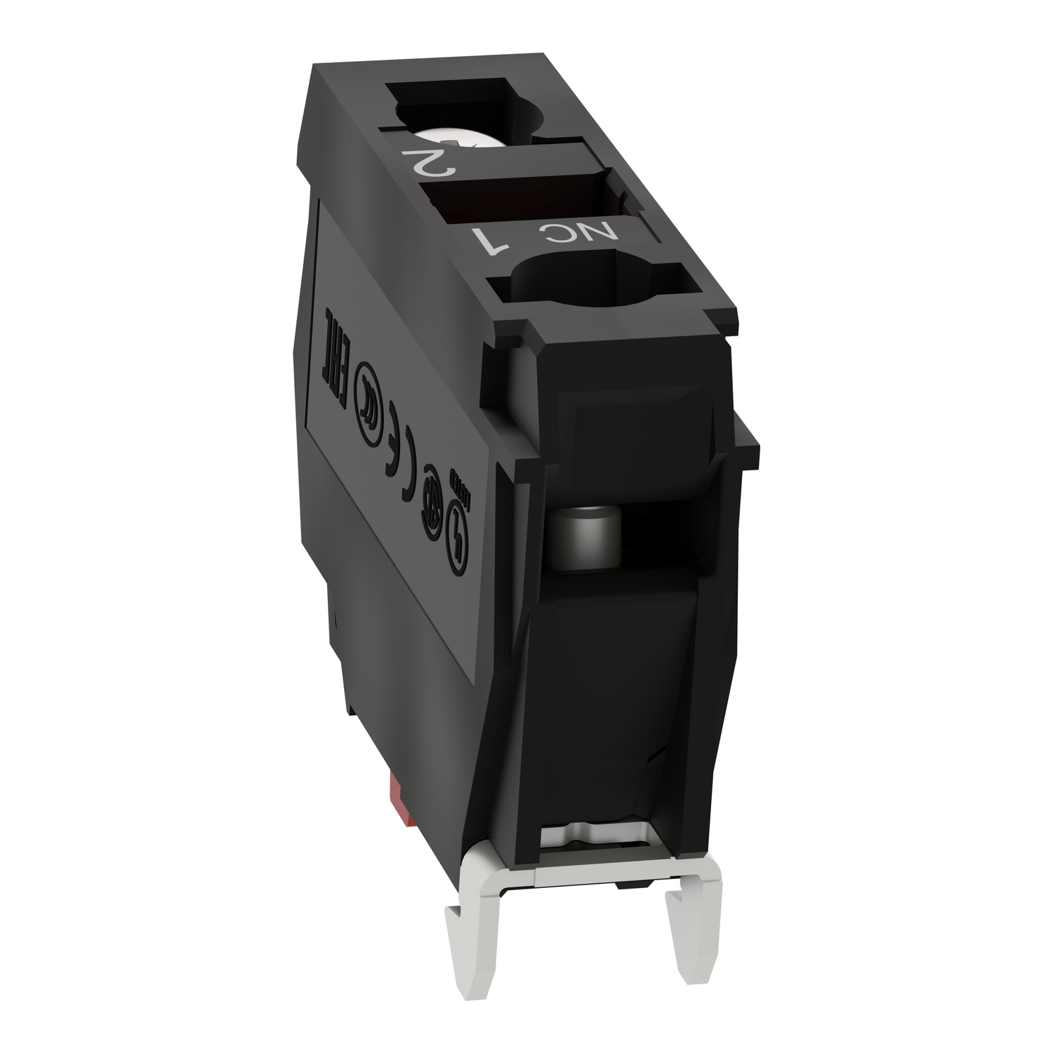 Este bloco de contatos Harmony ZB, XB5 single contact block usa terminais de abraçadeiras roscadas.,Este bloco de contato permite a substituição e configuração rápida e fácil das suas botoeiras e interruptores seletores.,Ele é facilmente instalado e substituído nas unidades completas de botão de pressão XB5 e interruptores seletores através de um conjunto de encaixe e conecta-se a circuitos de controle com conexões simples de parafuso de grampo.,Ela protege os operadores de contato inesperado com circuitos energizados graças ao seu índice de proteção IP20.,1 milhão de ciclos de alta resistência com carga de 6A permite menos manutenção e danos em sua instalação.,Ele tem um esquema de cores claro para os tipos de bloco de contato NO e NC.,Terminais de conexão de parafuso resistentes à vibração asseguram alta resistência à vibração, tornando o produto adequado para instalação em máquinas de alto impacto.