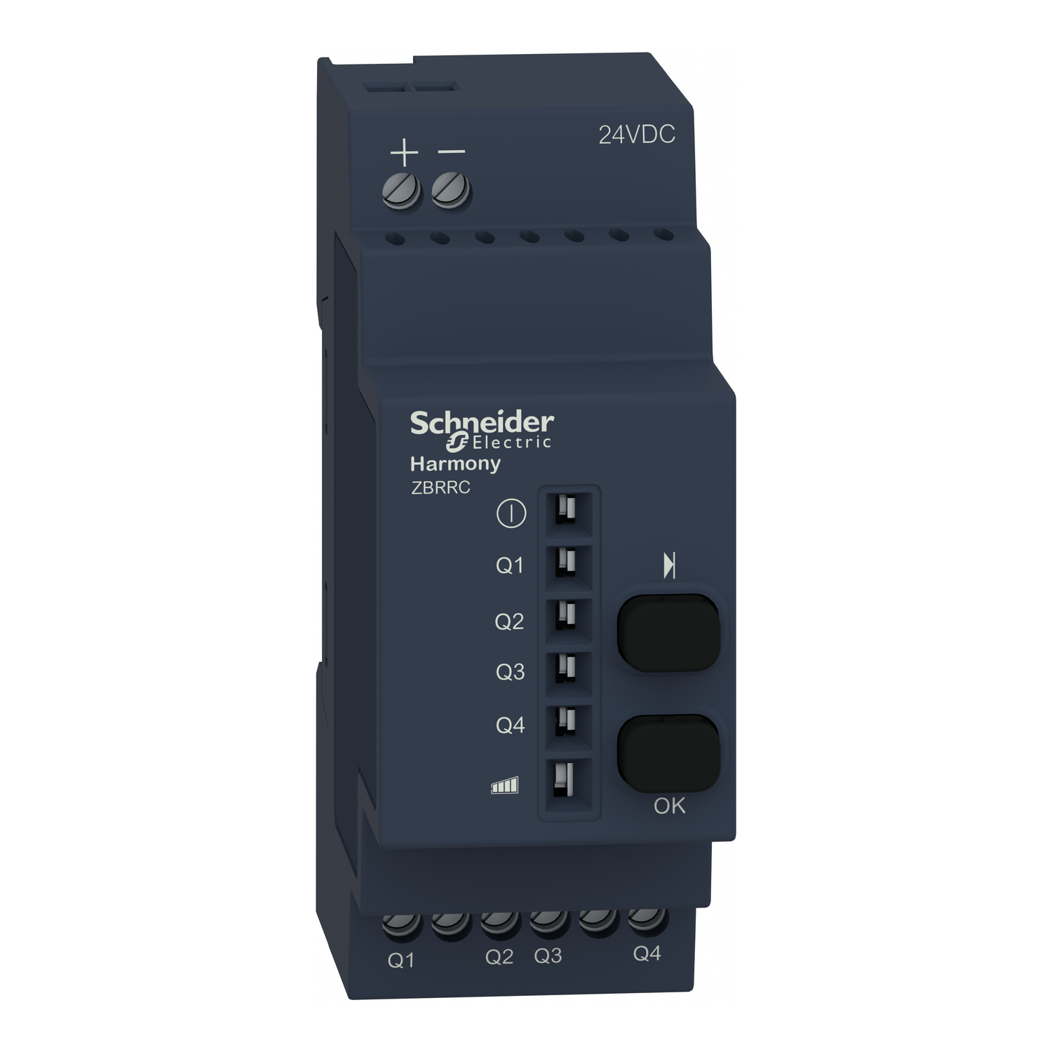 O ZBRRC é um receptor configurável que faz parte das linhas Harmony XB5R de plástico e XB4R de metal, botões sem fio e sem bateria.É equipado com 2 botões, 6 LEDs indicadores (ligação, modos de função, status de saída, intensidade do sinal).Possui 4 saídas PNP, 200 mA /24 V e pode ser alimentado com 24 VCC.É facilmente combinado com botões sem fio e sem bateria XB4R/XB5R e interruptores de limite XCKW/XCMW.Opera com o protocolo Zigbee green power 2,4 GHz em conformidade com IEEE 802.15.4.Seu índice de proteção é IP20.
